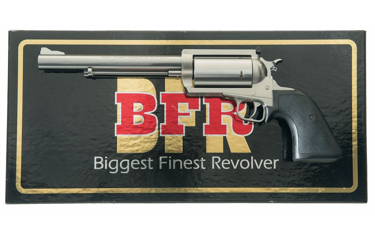 The Magnum Research BFR (Biggest Finest Revolver) was designed to handle the biggest handgun cartridges and even some rifle cartridges. This example is chambered in the venerable .45-70 rifle cartridge. It has a serrated ramp front sight and a fully adjustable rear sight. Fitted with a set of checkered hard rubber grips. With the original box numbered to the gun, cable lock, test cartridge, and papers.