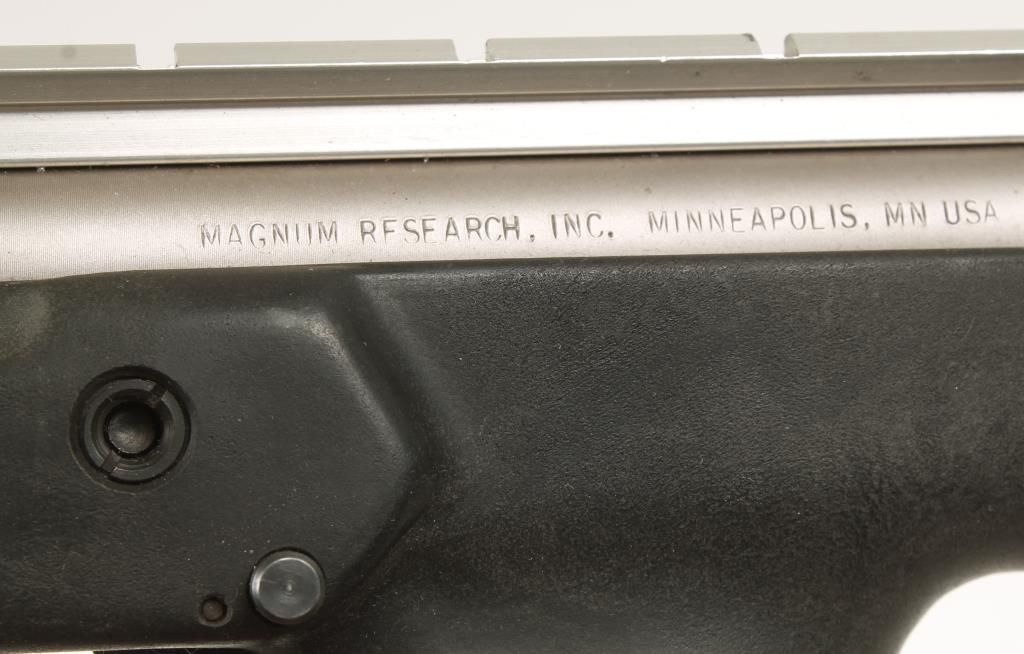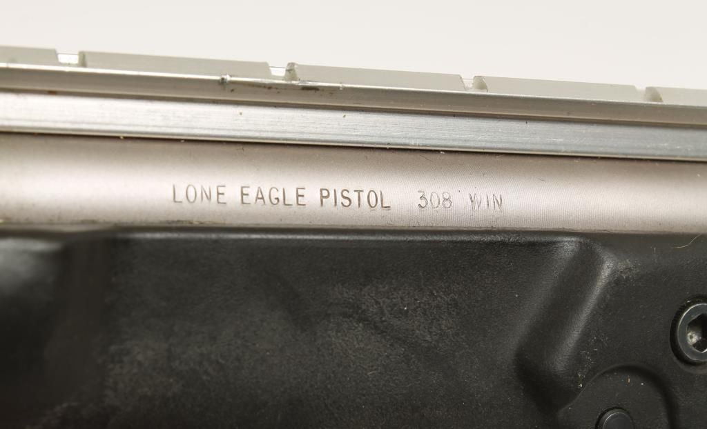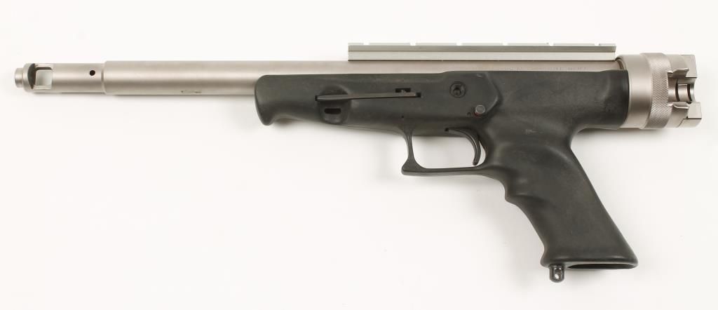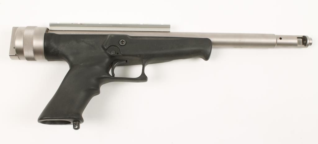 Single shot centerfire pistol with 13-1/2" barrel with machined muzzle brake (making total barrel length 16"). Satin stainless steel, molded polymer grips and stock, no sights and fitted with scope rail. Very good bore and action. Condition: Very good to excellent showing light handling. *Modern Firearm*