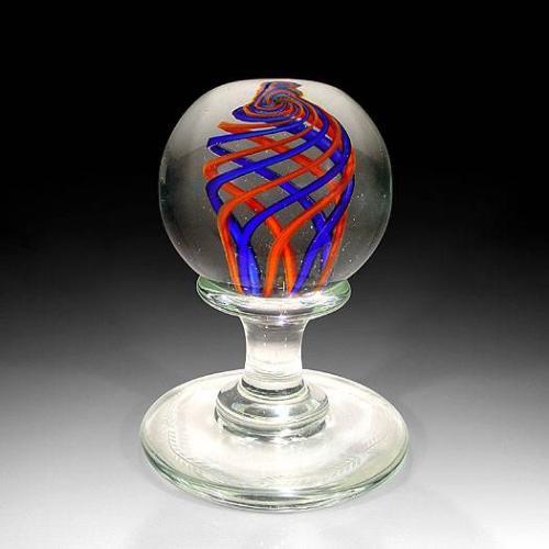 Magnum footed pedestal paperweight. The piece contains a large, oblong, red and cobalt blue swirl, over a clear, footed, pedestal base. Engraved vines of leaves surround the border of the circular base. Height 8 1/4", diameter of base 6 1/2".