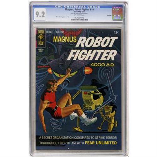 <B>Magnus Robot Fighter #19 File Copy (Gold Key, 1967) CGC NM- 9.2 Off-white pages.</B></I> Russ Manning story and art. CGC notes, "From the Random House Archives." Overstreet 2007 NM- 9.2 value = $70. CGC census 10/07: 6 in 9.2, 7 higher.<BR><BR><b>Shipping:</b> Comics - Slabbed (certified) (<a target="_blank" href="http://www.heritageauctions.com/common/shipping.php">view shipping information</a>)