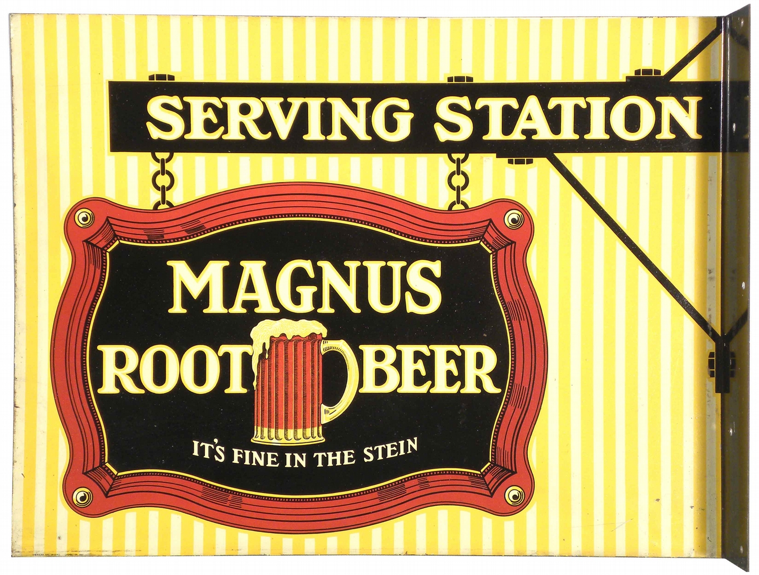 Magnus Root Beer Tin Flange Sign. 2 sided. American Art Works, Coshocton, OH. A few rubs otherwise excellent condition. 18 X 13 1/2 inches.