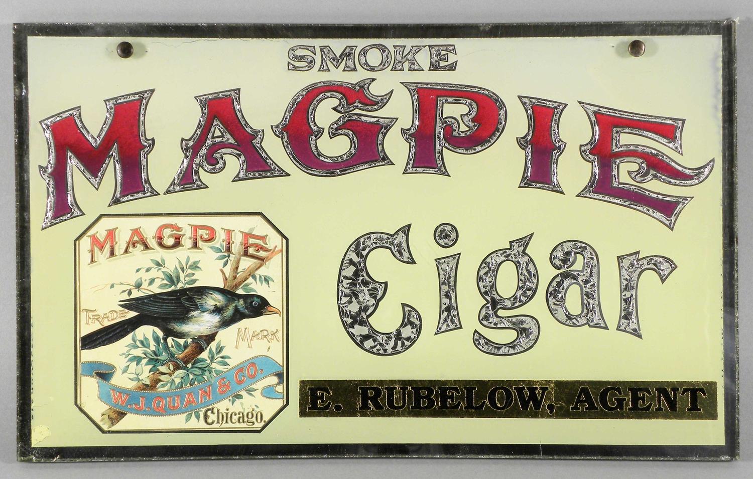 Magpie Cigar Glue Chip Lettering Reverse Glass Chain Hanging Sign. E. Rubelow, Agent. Bottom left corner slightly lifting otherwise excellent condition. 14 X 18 1/2 inches. Start Price $100