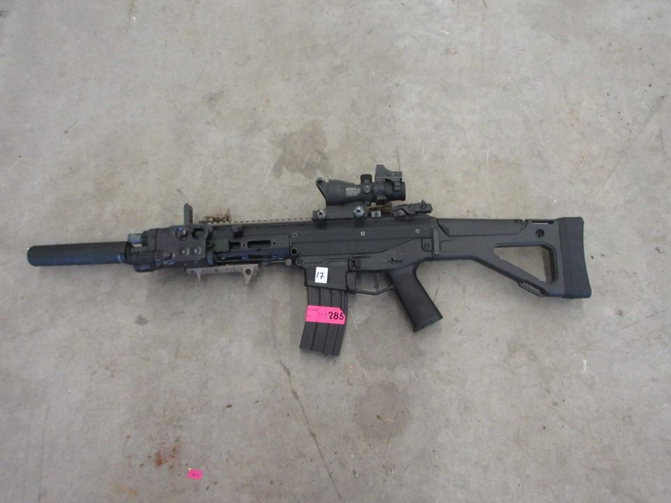 Has barrel extender, banana clip. Multi-caliber. 350 fps