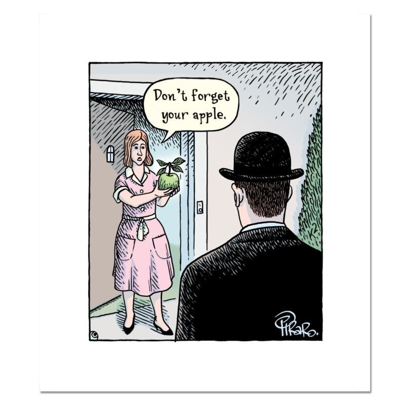 "Magritte Apple" is a limited edition giclee on paper by Dan Piraro, creator of the critically acclaimed and award winning comic strip, Bizarro! This piece is numbered and hand signed by the artist and includes a letterof authenticity. Measures approximtely 8" x 15" (image).