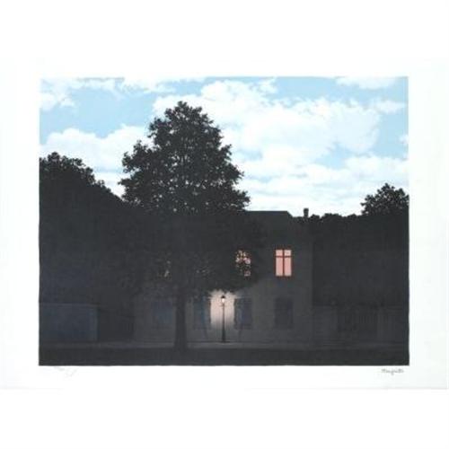 Notes:Lithograph after (d'apres) Magritte, facsimile signed with Magritte Estate watermark, authorized by ADAGP, France. Printed on pure chiffon, Velin de Rives, 300 gr/square meter. This image was recreated by a master engraver and required over eighteen passes through a flat-bed lithographic press to be completed. Each print is signed in the plate, stamped with the seal of the Magriite Estate and signed by the publisher on the verso. This is part of an editon of 300 and measures 22 3/4 x 30 3/4 inches. The Empire of the Lights was painetd in 1961 and it is part of a private collection. This painting illustrates Magritte's personal interest and fascination with the play between night and day, and his poetic wish to bring them together by showing in perspective their resemblance and their difference.
