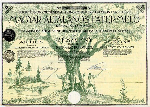 1925, Budapest. Stock certificate. Black/Brown on light green paper. Unique art work of lumbermen cutting tree down in forest. Uncancelled and Very Fine.