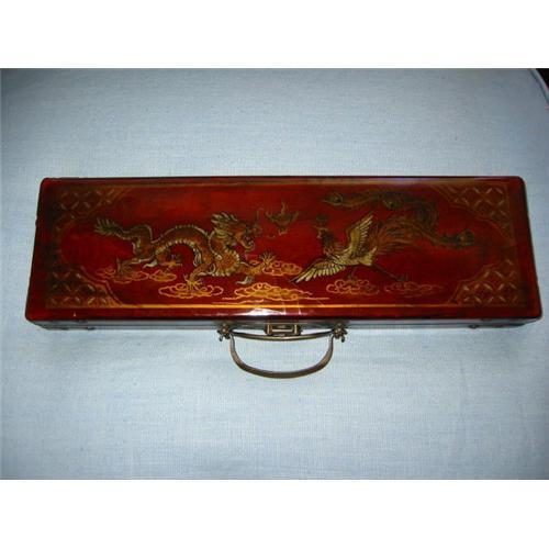 this stunning case is made of wood with metal hinges and locks. the top is covered with vinyl and image of dragon and bird with soft golden colors. it is elaborated and very nice. the game is complete with 144 tiles with seasonal images on plastics rectangular shape as game accessories w multicolored chips which i have not count them all. it also has one dice along with instruction.the wooden case both sides internally is covered with oriental colored papers with writings of some kind. on the base also has a red laquered hot permit stamp. this game is functional yet collectible. the case is absolutely beautiful. it measures about 5 inches tall, 17 inches wide and about 2 inches deep when is closed. the metal accents are nice and adds depth to this nice game. the game is in very good condition, minor scratches as well as creases for being vintage.normal wear and tear.the game also has a metal handle to carry with key. i am certain that it is something to think about.