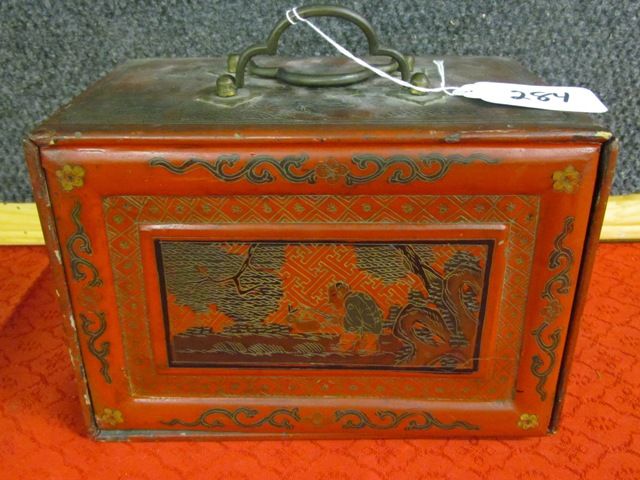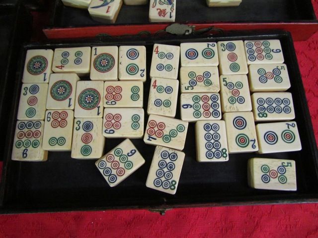 19th Century Mahjongg Tiles Ox Bone in Oriental Red Decorated Box