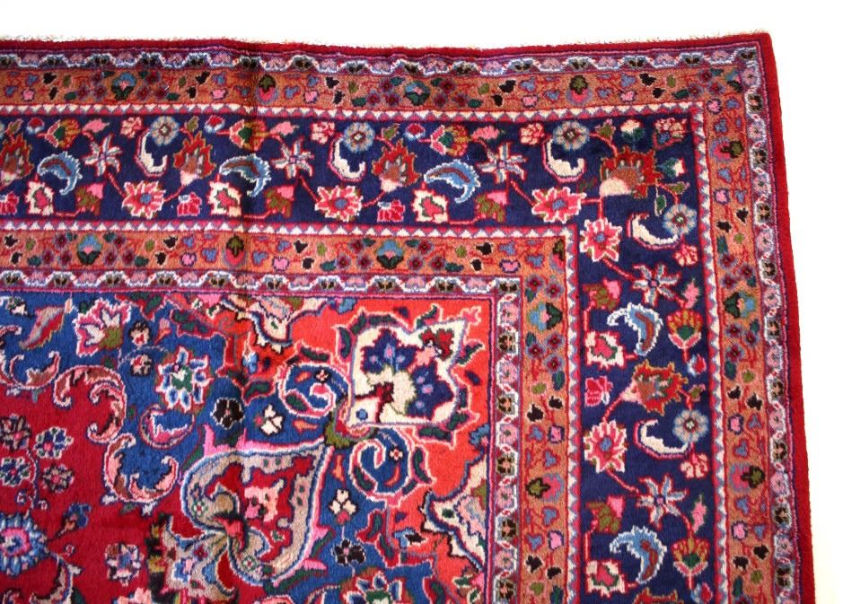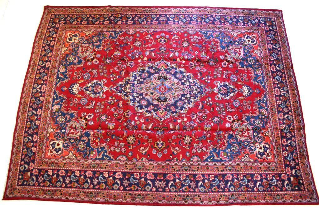 Featured in this lot we have a hand knotted Persian Mahal wool area rug originating from the early 1900's. The rug features a fine detailed design, bright colors, and a tight weave. The Mahal rug is a well known style of Persian rug that features geometric floral patterns and a large medallion. The rug displays geometric floral patterns across the border with a single large geometric medallion at the center of the rug. The piece shows geometric designs mirrored in each corner. The rug predominately a bright red, blue, yellow, green, white, brown, orange, and pink. The rug shows short white tassels along the border of the piece. The piece shows good condition overall with little wear and use. The rug measures 9' 8" wide by 12' 8" long.