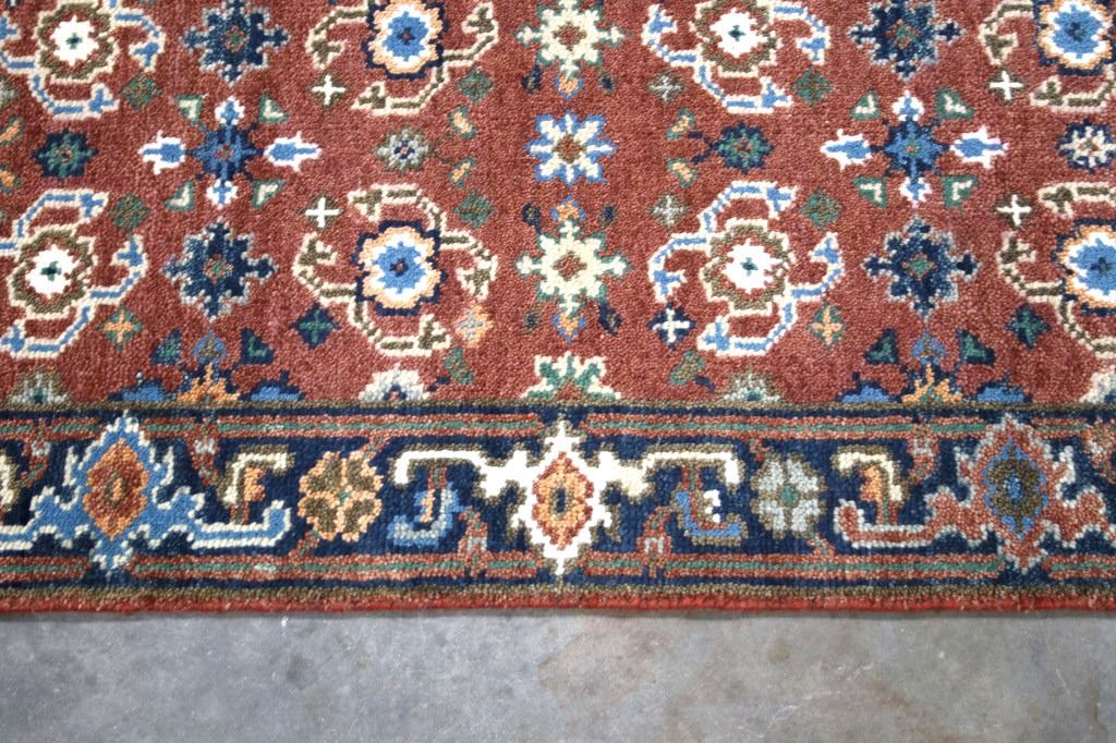 Featured in this lot is a hand knotted Persian Mahal wool runner rug originating from the early 1900's. The rug features a fine detailed design, bright colors, and a tight weave. The Mahal rug is a well-known style of Persian rug that features geometric floral patterns and a large medallion. The rug displays geometric floral patterns across the border with geometric designs across the center. The piece shows geometric designs mirrored in each corner. The rug is predominately a dark red with green, white, blue, brown, orange, and dark blue. The rug shows short white tassels along each end of the piece. The piece shows good condition overall, with little wear and use. The rug measures 29" wide by 95" long.