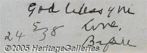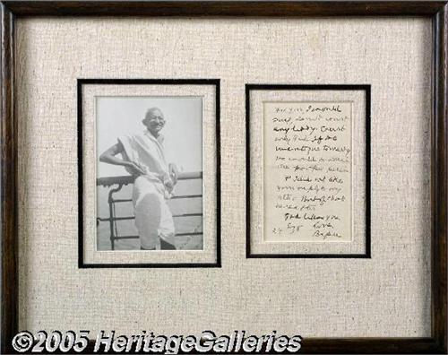 <B>Mahatma Gandhi Framed Signed Letter 1938 and Photo</B></I> Autograph letter signed with his nickname "Bapuji", two pages, 4" x 6", May 24, 1938. He writes in part: "...For you, I would say don't court anybody. Court only god. If he wants you to marry, He would produce the proper person. I did not like your reply to my letter. But that hereafter. God bless you, Bapuji..." Horizontal crease, otherwise in excellent condition. Tastefully matted in linen and framed with a photograph of Mahatma Gandhi. A rare treasure. <I>Accompanied by COA from PSA/DNA.</B></I>