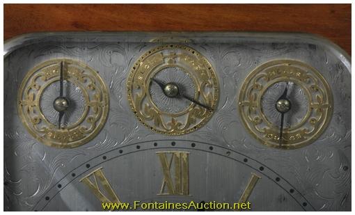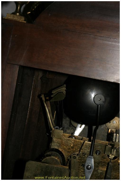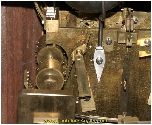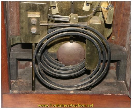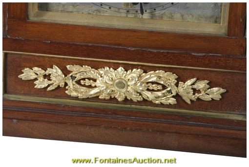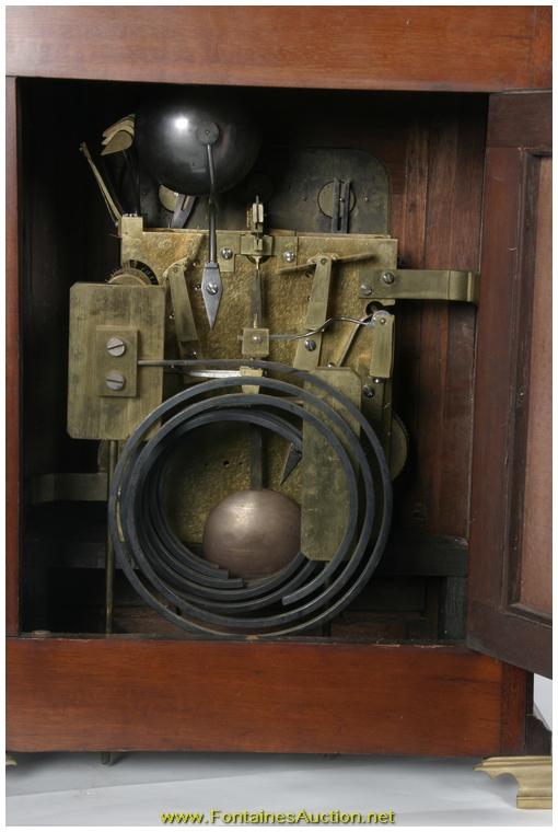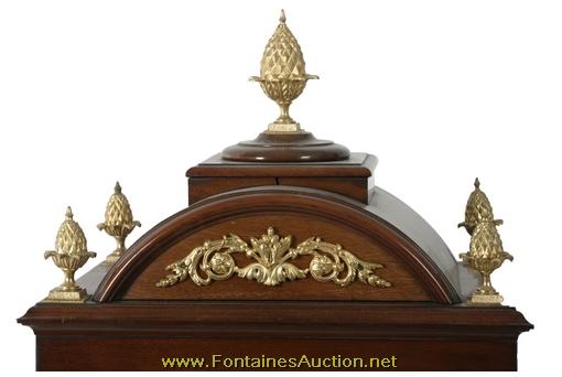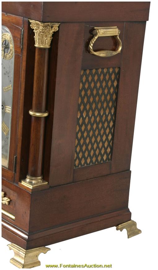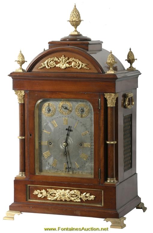 Mahogany 8 Bell Fusee Bracket Clock. Fancy etched and silvered dial w/ black hands and minute markers and applied gilt bronze roman numerals and sub dials (chime/silent fast/slow bell/gong). Quality brass fusee movement and pendulum; strikes on 8 bells or 5 coiled gongs. Nice mahogany case w/ turned columns, gilt bronze mounts, finials and handles. In excellent condition. 16"W x 28"H x 12"D. Estimated Value$3,000 - 5,000.