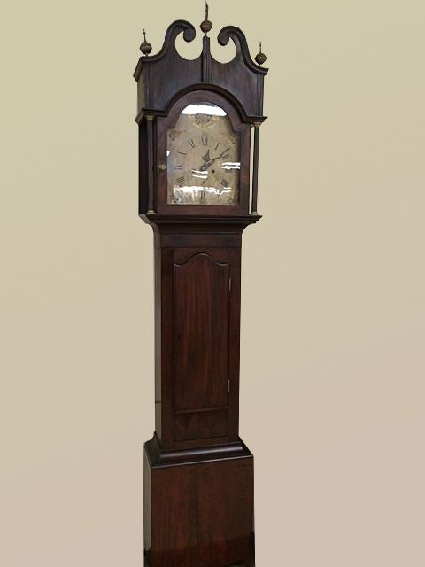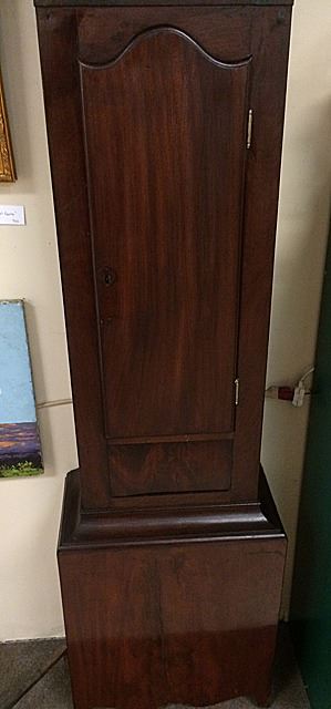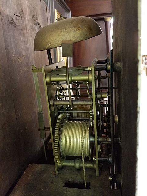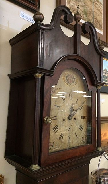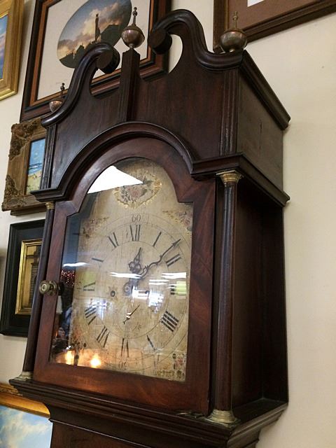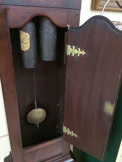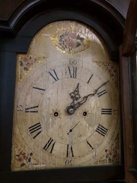 Antique grandfather clock with beautiful mahogany case, hand painted dial with flowers and gold gilt, 2 weights and pendulum 8 day grandfather clock, brass hardward, open ornate hands and second dial, measures approx. 92" tall.