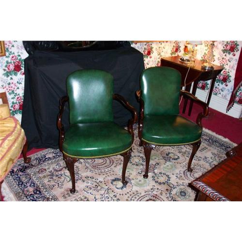 Men's green leather arm chair with hob nail upholstered finish. Mahogany wood with a swan legs. One of two available.