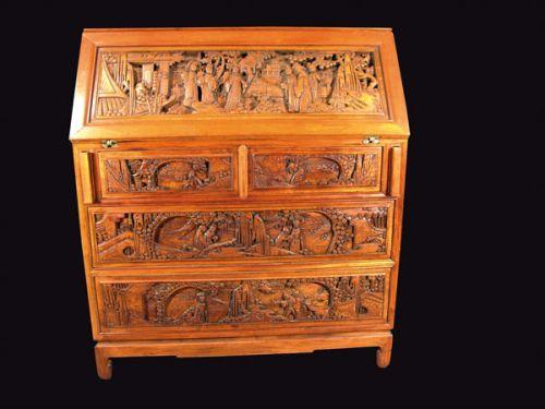 Mahogany Desk, Asian carved motif. Original finish. 36 X 41 X 17 inches.