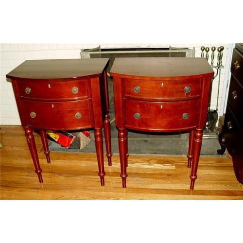 Nice matching pair of clean mahogany bombay bowed front end tables, 2 draws with fine bronze pulls, and complementing turned legs, measuring 32 inches in height, 22 inches in width and 15 inches in depth and would make a superb addition to any fine household.