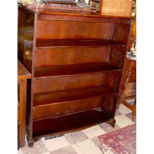 Nice 4 level mahogany Chinese Chippendale serpentine front bookshelf with a nice fretwork adorned cornice raised on 4 ogee feet, measuring 49 inches height, 39 1/2 inches length and 11 inches width. Condition: some water damage and staining to the feet and bottom, overall fair condition.