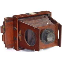 Eclipse", 1890 € 140,- Edelholzgehäuse, Holzspreizen-Konstruktion, brauner Balgen, 3 @ x 4 @", Messingobjektiv "Darlot, Paris", Shew-Verschluß mit Revolverblende, Verschluß arbeitet nicht. Mahogany body, brown bellows, gate strut construction, Darlot lens. Shutter "Shew", revolving aperture, shutter does not work. - (3/3-) - € 200/300 - (3/11)