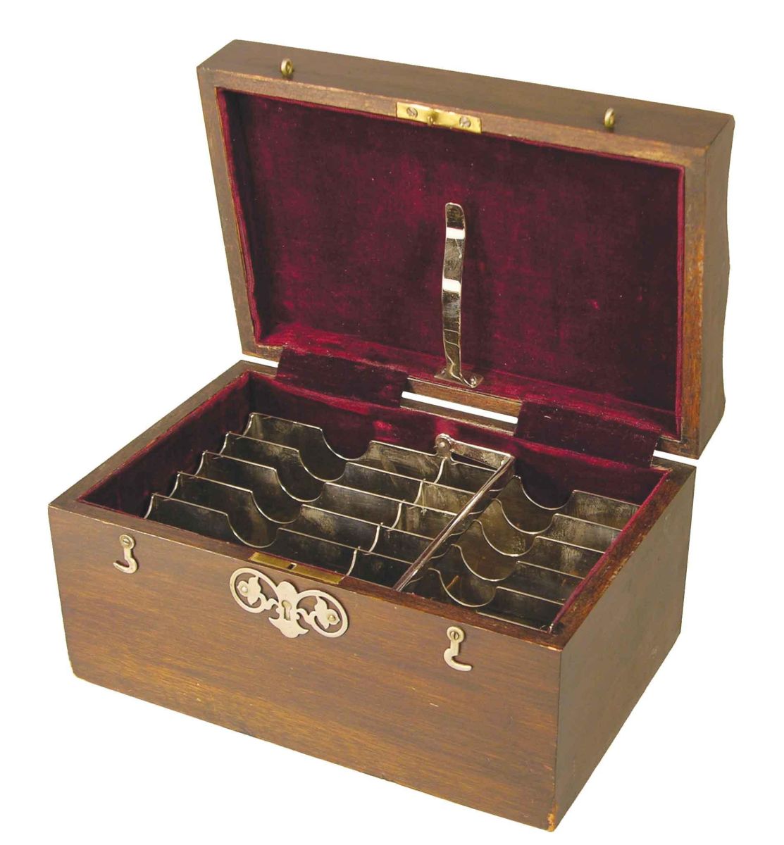 Mahogany Card Case for twelve decks of cards, ca. 1910. Has silver overlay and silk lining. Excellent condition. 8 3/4 X 4 1/2 X 5 3/4 inches.
