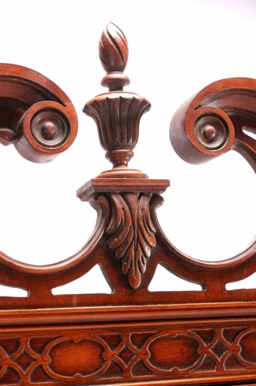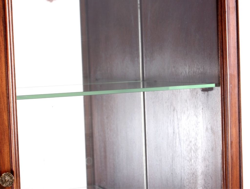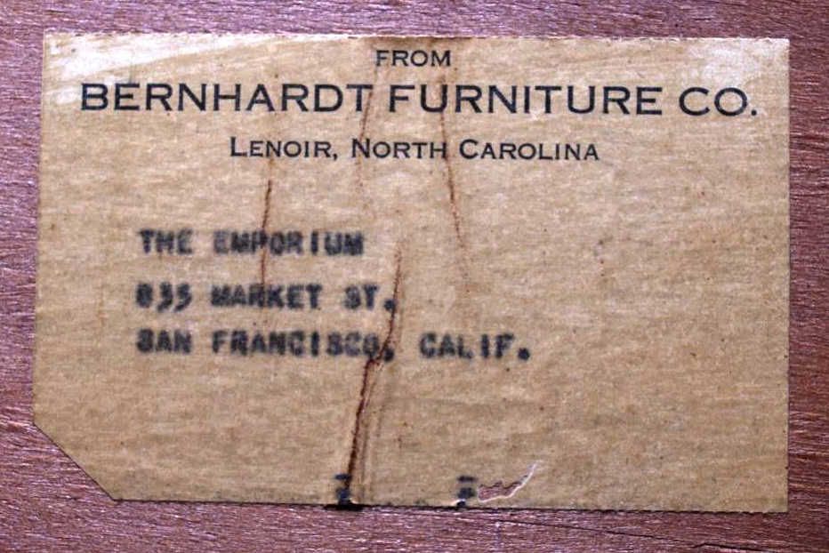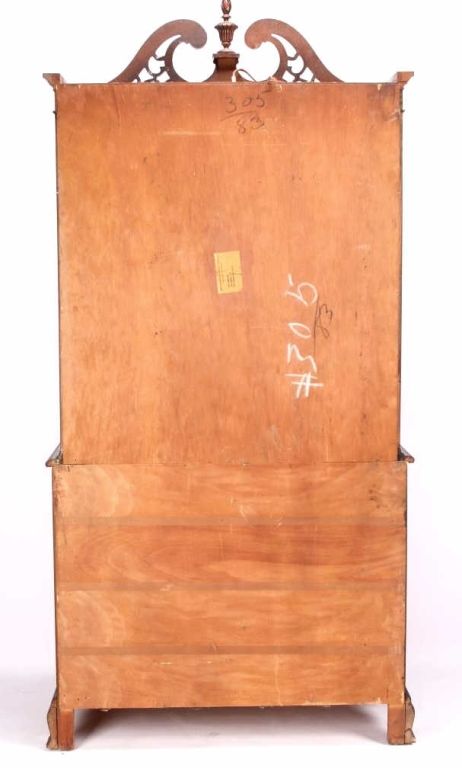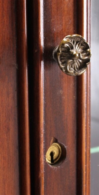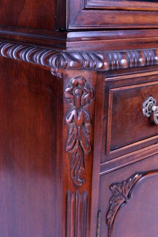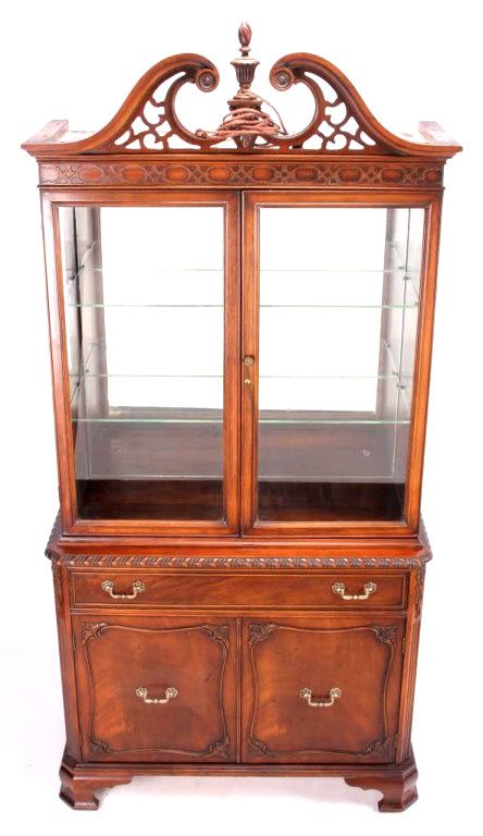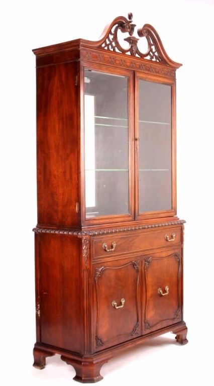 This piece shows a carved design with wonderful condition. This is from the Bernhardt Furniture Company in Lenoir, North Carolina The cabinet is made of solid Mahogany showing glass shelves and brasshardware. The early 1920's piece has a mirror back and lighted top (added later). Very well made piece. The back has a furniture tag which shows it was delivered to The Emporium in San Francisco. n 1889, John Bernhardt, aman with imagination and drive, founded Bernhardt Furniture Company in rural North Carolina. This eager North Carolina entrepreneur began making an impression on the urban businessmen who would ultimatelycome to know his reliability and integrity. Measures 79" tall and 38.5"x16.5"