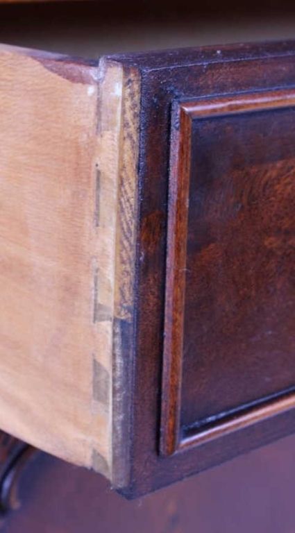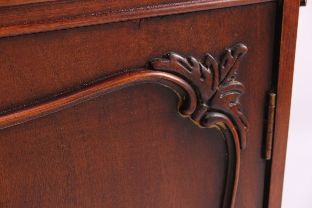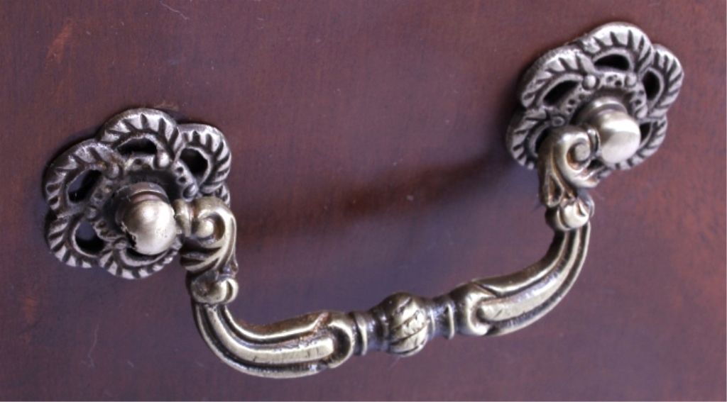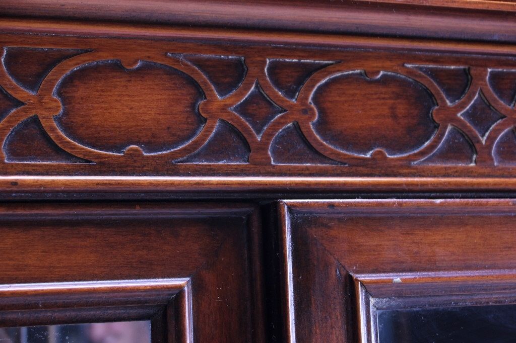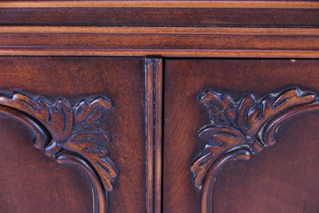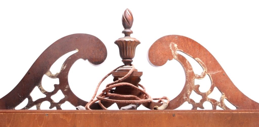 This piece shows a carved design with wonderful condition. This is from the Bernhardt Furniture Company in Lenoir, North Carolina The cabinet is made of solid Mahogany showing glass shelves and brasshardware. The early 1920's piece has a mirror back and lighted top (added later). Very well made piece. The back has a furniture tag which shows it was delivered to The Emporium in San Francisco. n 1889, John Bernhardt, aman with imagination and drive, founded Bernhardt Furniture Company in rural North Carolina. This eager North Carolina entrepreneur began making an impression on the urban businessmen who would ultimatelycome to know his reliability and integrity. Measures 79" tall and 38.5"x16.5"