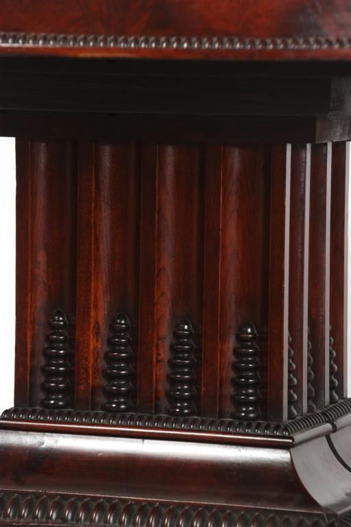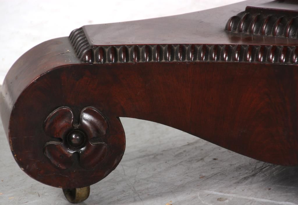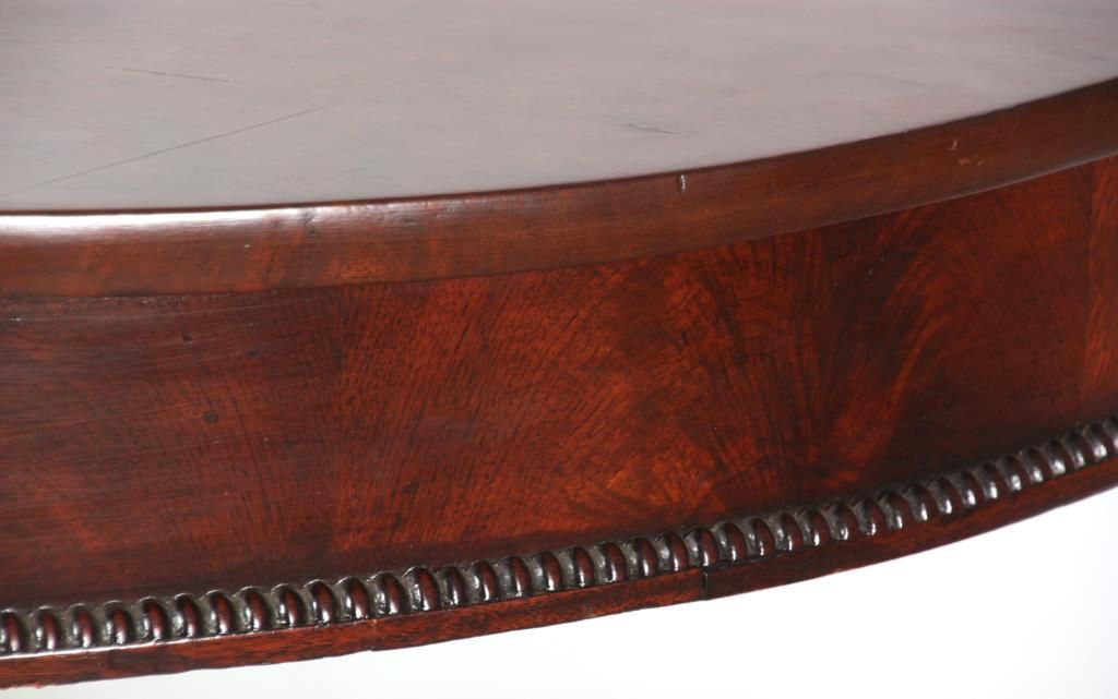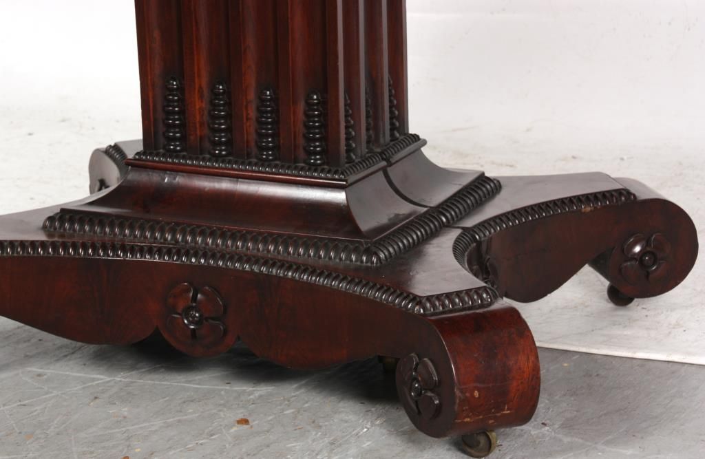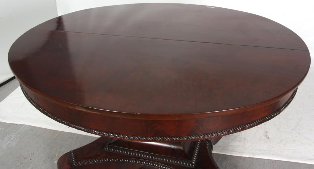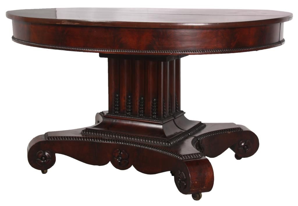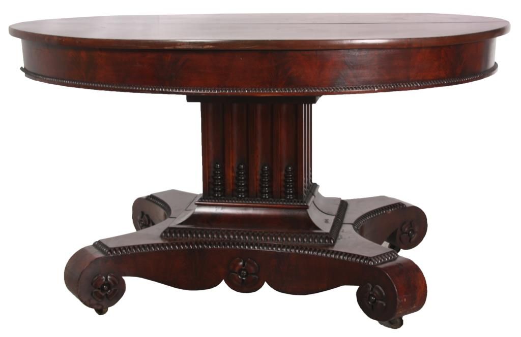 Mahogany Carved Dining Table, Attr. Meeks. Oval top has a thick apron with piecrust edge; on a split pedestal base with deep fluted design, stands on scrolled feet mounted with large floral rosettes. Has 7 skirted leaves measuring 15 in. wide, missing center leg. Table measures 31 in. high x 54 in. wide x 43 in. deep – up to 12 ft. 4 in. long.