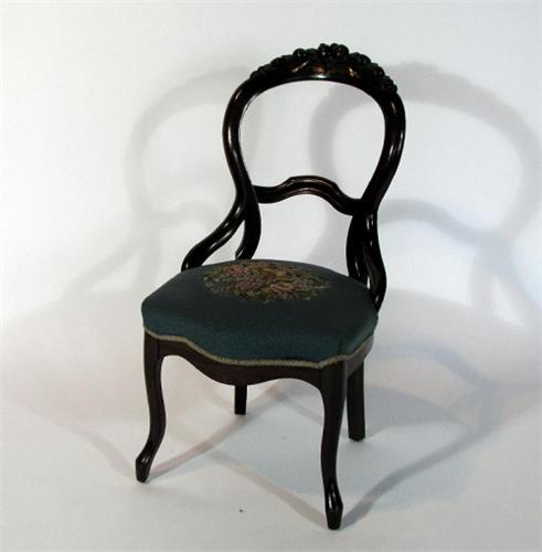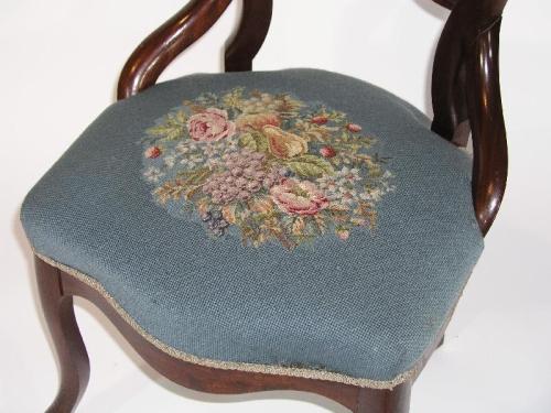 Mahogany chair with needle point flower and fruit designs in seat, light blue color, 35 1/2" by 18" by 18 1/2"