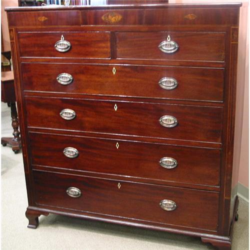 Excellent late Georgian Mahogany Chest. 'Britannia'(symbol of Great Britain), Union flag, Shield and British Lion, all depicted and inlaid onto the front of a 'Secret drawer'. Shell inlays, Bronze handles and ogee bracket feet. Great color. RARE. C.1820