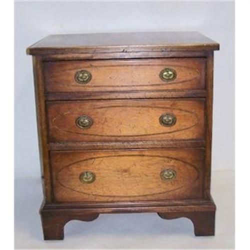 A little beauty, this small little chest of drawers, is the perfect size to use as a table between two chairs, or beside a chair for a lamp table .It is made of a nice light brown mahogany, & has a simple string inlay oval outline on each drawer front .The style is very traditional & made in the early 1900?s .The condition is very good with a nice surface patina. It measures .20 ¼? high x 18? wide x 14? deep