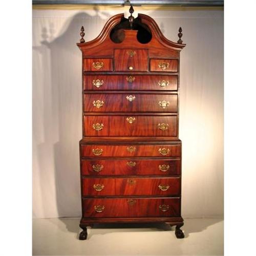 Mahogany and mahogany veneered bonnet top chest on chest having three over three drawers above a base of four drawers resting on chippendale ball and claw feet. Classic lines of a period chippendale chest with a finial decorated broken arch bonnet top. The front of the chest has wonderful graining to the veneer. The pulls are correct replacements. The top and bottom appear to be of dfferent origins. This item dates to circa 1800. Has no repairs to the feet or other visible restoration.