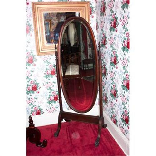 Mahogany framed standing Oval beveled mirror with a hairy paw foot and wood castors. All original in excellent antique condition.