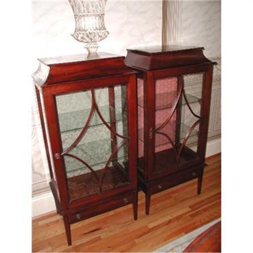 Rare pair of magnificent period mahogany china cabinets,vitrines or bookcases with desk top from England C.1850 with interior glass shelving. Drawer below on each. The thick top on each raises to reveal a mini desk, small compartments with one compartment offering a concave tilt slide of mahogany similiar to a laptop desk with storage below. Could be used for jewelry as well or bookcase and desk in one.The two back panels,one in peach and cream,the other in pale green brocade slide out from the top for whatever fabric or paper the owner desires. Excellent for collection display case as well. Measures 47.5H X 22.25L X 15.5D. Additional photos available.