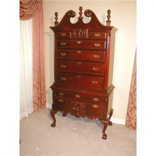This is a solid mahogany, chippendale style , highboy chest with ball and claw feet and a classical broken arch top. The top is embellished with three turned and carved flame finials. The hardward is heavy , solid brass. The highboy has 11 drawers with two drawers having carved fronts. This piece is georgous, made from solid mahogany on all sides including the insides of the drawers. This piece was possibly made in Indonesia and is of high quality. I have two keys to lock the drawers. The acunthus leaf carvings make this piece a standout in any room.