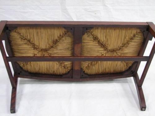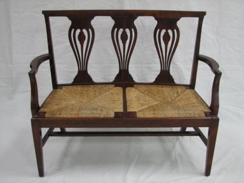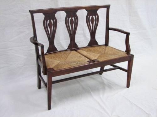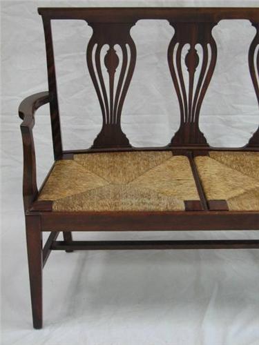 Late 19th Century Mahogany Straight Leg Chippendale Woven Rush Settee. Features triple pierced splat back with straight scrolled back, curved arms to hand, original woven rush seat. Excellent condition. Dimensions: 36.5"H x 44"L x 19"D.