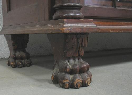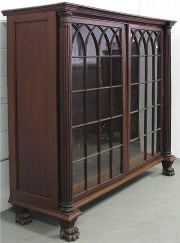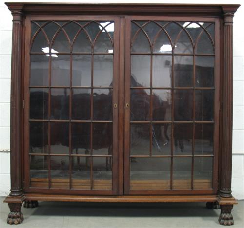 Mahogany Chippendale style double glass door bookcase; overhanging cornice over double glass doors with fretwork; flanked by fluted columns; on four paw feet; recessed paneled sides; early 20th C.; measures 59 1/2" high x 62 1/2" across x 20 1/4" deep (no visible defects)