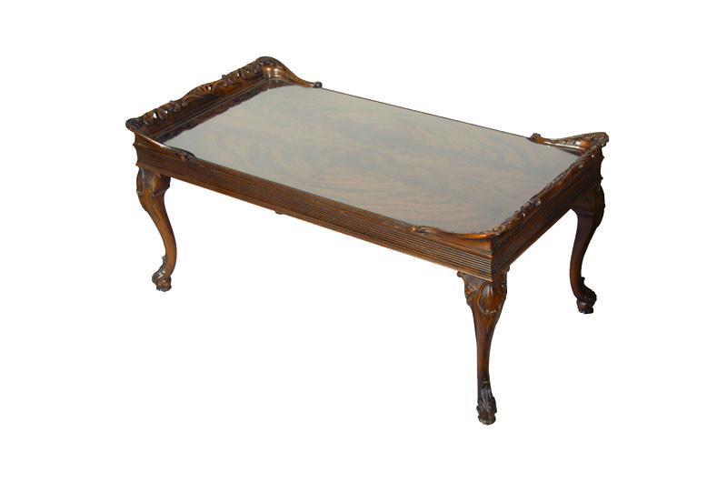Mahogany Coffee Table, Circa 1920s Cabriolet, book match veneer, plus pie crust lamp table, both need restoration.Cabriolet, book match veneer, plus pie crust lamp table, both need restoration.