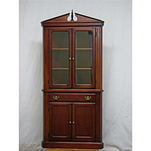 Mahogany Corner Cabinet with broken scroll pediment, two shelves behind two doors, over drawer and two doors concealing one shelf. 78H, 36W, 24D. Condition: no damage noted