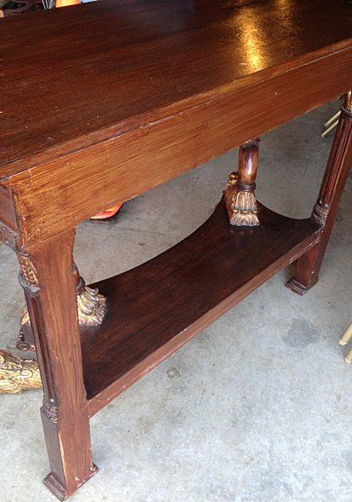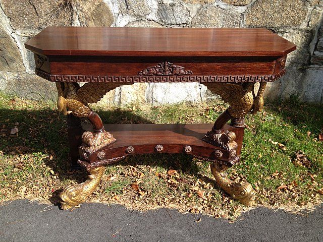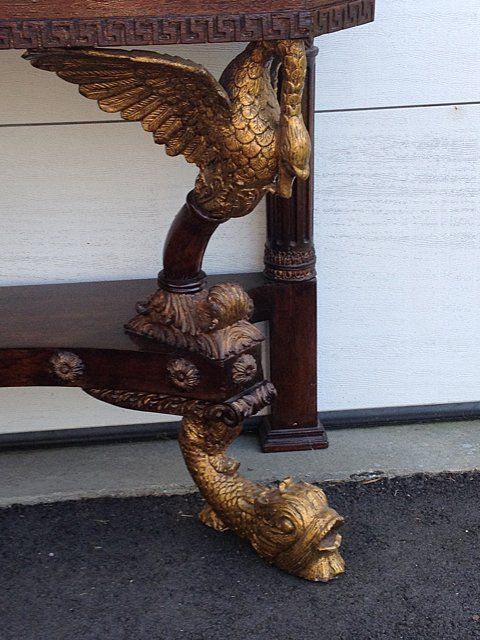 Mahogany Decorative Pier Table very ornate decorative pier table with fully carved gold gilted swans on either corner supported by dolphins at the base (also gold gilted), has winged Gabriel angel trumpeters on either end griffin carved in center of skirt. Stunning decorative piece that could be used in the entrance way of home or statement piece as you are entering any room. Very eye apealling with the gilting on the swans and the fish. Measures 46"long x 19 1/2" wide x 35 1/2" tall.