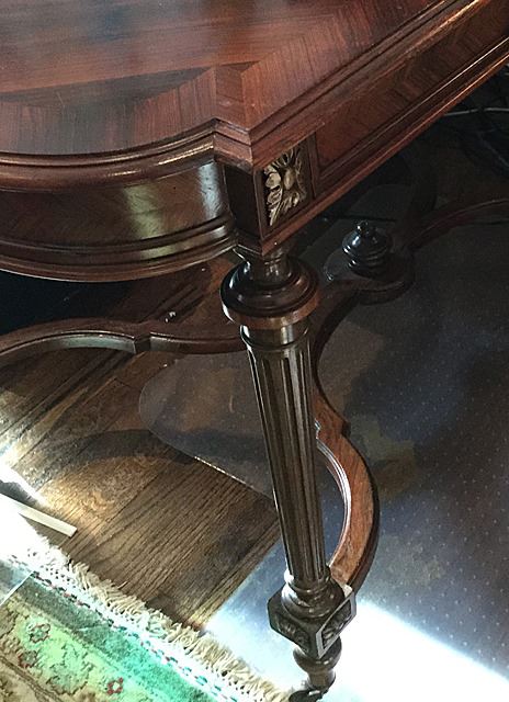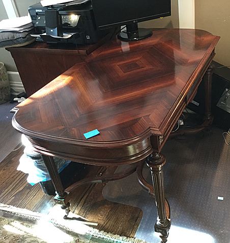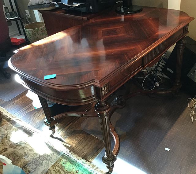 Mahogany desk with banded inlay and carved detail in very good condition, measures approx. 52"w x 28"d x 28"h.Ê