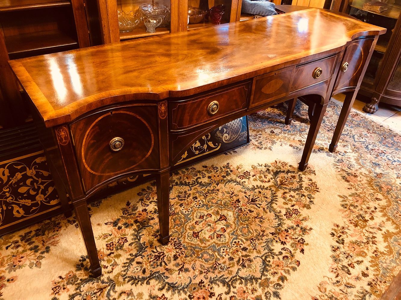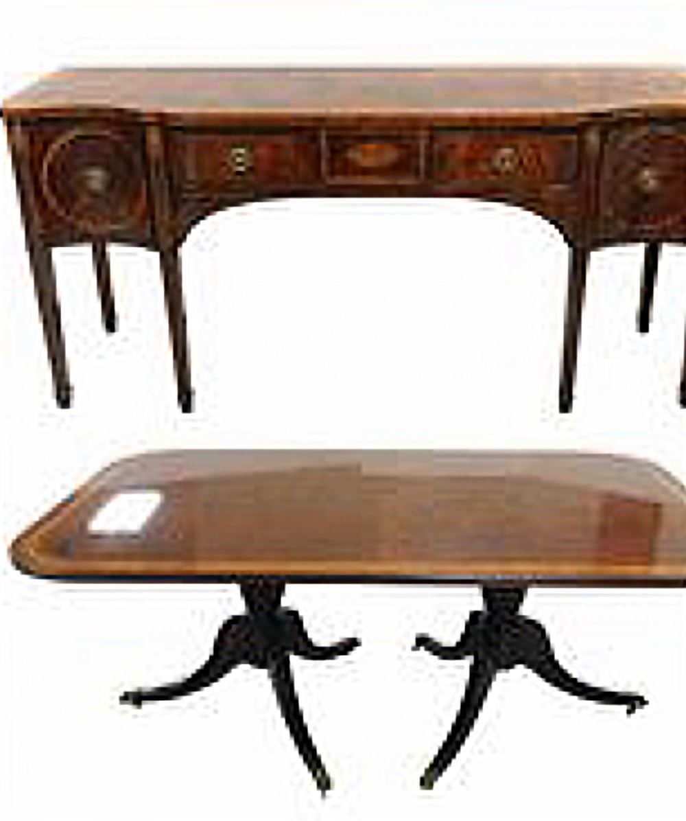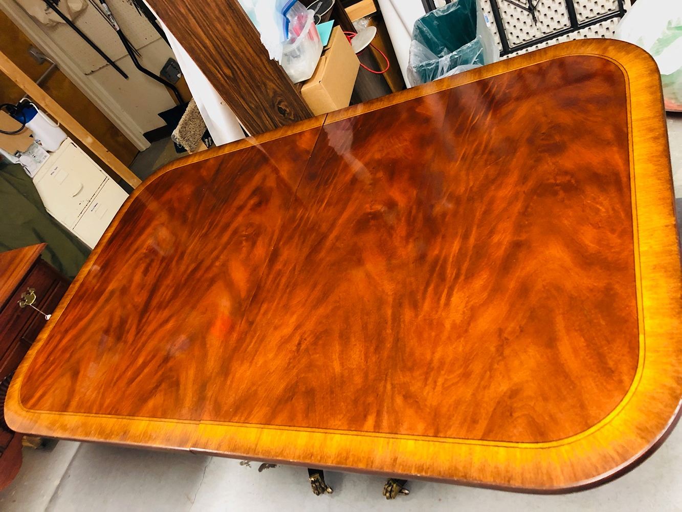Mahogany Dining Table, double pedestal, 2 matching leaves (each measures 22 inches wide x 46 inches long). With 8 matching chairs, 6 side and 2 arm, Chippendale carved back, slip seat chairs with matching side board all inlayed, top of the table is highly polished, ready to go right into your home. Set was sold by Lillian August, price of $4,950 still on the table.