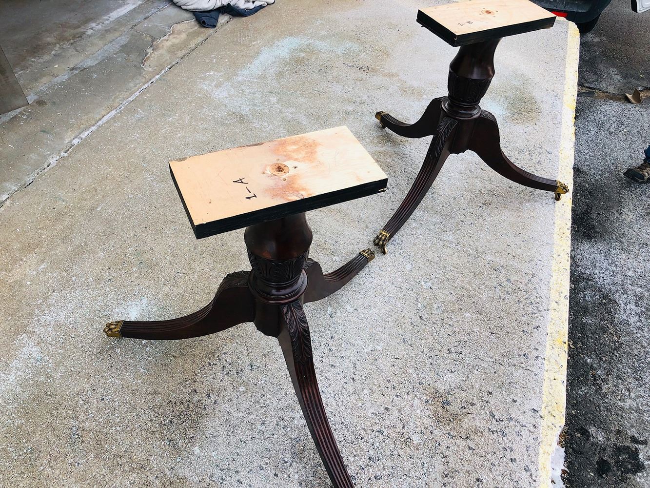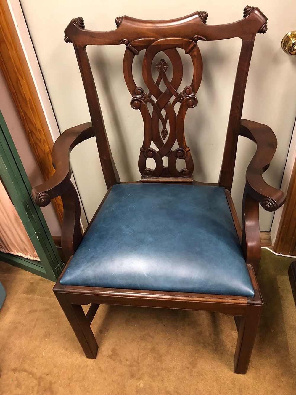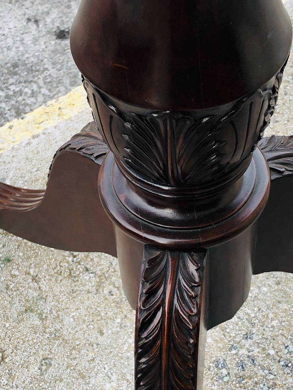 Mahogany Dining Table, double pedestal, 2 matching leaves (each measures 22 inches wide x 46 inches long). With 8 matching chairs, 6 side and 2 arm, Chippendale carved back, slip seat chairs with matching side board all inlayed, top of the table is highly polished, ready to go right into your home. Set was sold by Lillian August, price of $4,950 still on the table.