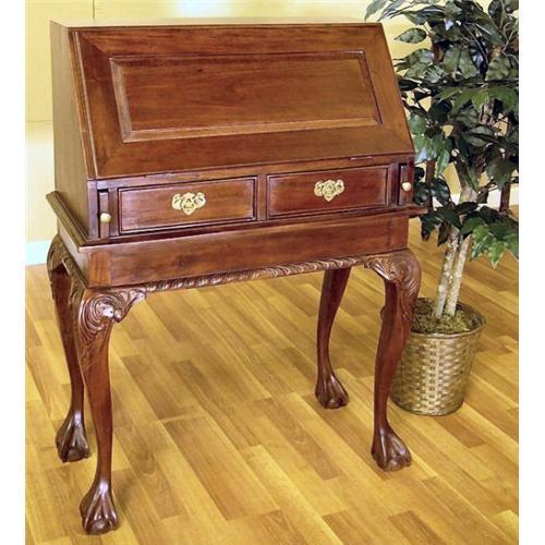 Beautiful Solid Mahogany Victorian Style Ladies Drop Front Desk. This desk is constructed from solid mahogany wood and it is made in the Chippendale Style. This piece features a slide ?in arm to support the drop front when it?s open, it features 2 drawers under the drop front, 7 cubby holes, where you can store a lot of your belongings. All drawers and cubby holes feature brass pull handles