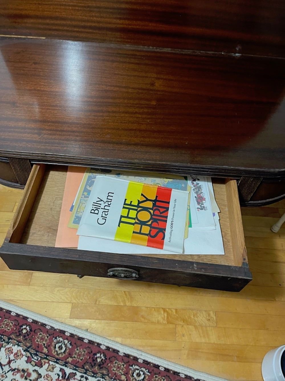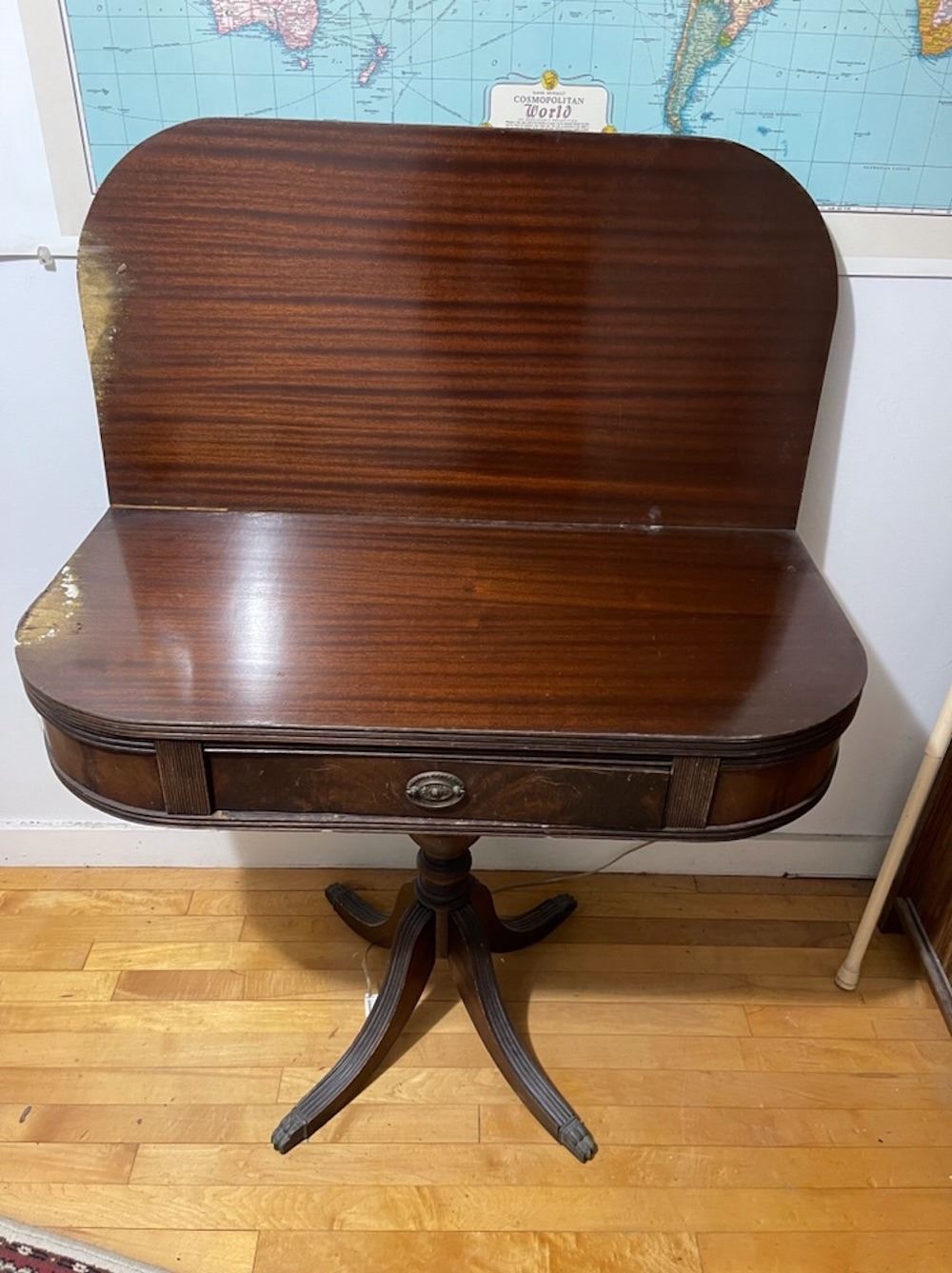Mahogany Duncan Phyfe lift top table with 1 drawer, has some water stains on edge. From the lifetime collection.