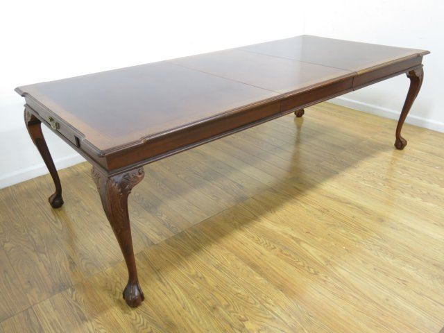 Ball and claw corner leg. With drawers. With 1 leaf, approx. 24". Total measurement approx. 30" H x 81" W x 43 1/4" D with 2" banding. Minor surface scratches.