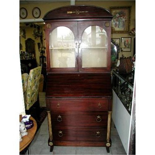 C.1900 mahogany federal secretary is extremely well made with rich mahogany and all drawer interiors of maple. The arched top is echoed in the two glass double doors with interior fixed shelf,star and brass tassle drop pulls. The drop down writing area has lock with no key and offers 4 wide pigeon holes,2 perpendicular unmits and center door with storage space. Three deep drawers have larger brass star and ornate loop ring pulls which match the ornate brass side mounts with ribbing. Brass medallions on either side of the top and bottom apron.This is a one unit piece which does not come apart. Excellent condition. Measures 71H X 16D X 31.5W.