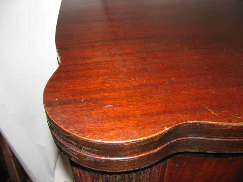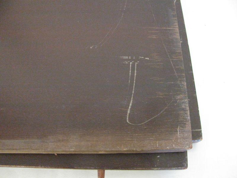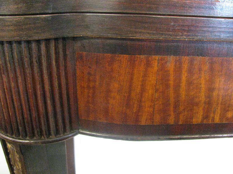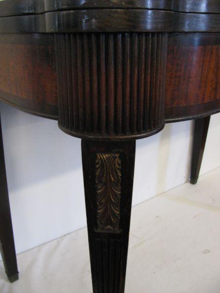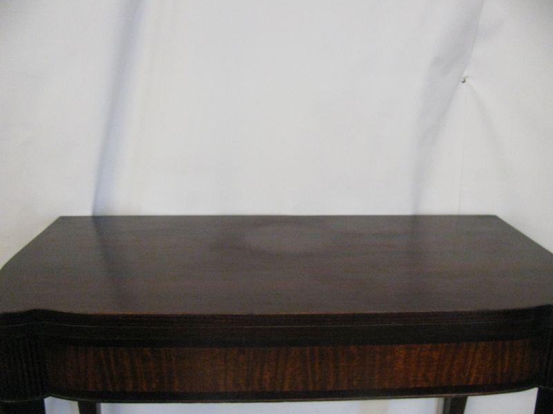 Federal style, probably from the 1920's-40's. Nice burled panel on front and sides, minor 'ring' on top, nice finish on inside. 2 fold up legs, 3 leaves,leaves have scuffs. This table opens to 81" long! Sz: 21" x 30" x 41" LOCAL PICKUP ONLY, OR BUYER TO ARRANGE SHIPPING