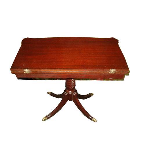 I am offering a very nice mahogany game occasional table which measures 29 inches high, 31.5 inches wide by 30.5 inches deep when fully extended. It features a fold over top above a detailed incised line carved swirl pedestal, terminating into duncan phyfe legs with paw feet. This beautiful piece can be used as a game or cocktail table. I consider this table to be in very good condition save some minor spotting on the foldover top which does not detract at all from its overall appearance. Please zoom the photos, and you will see that this very nice piece is being offered at a reasonable price!