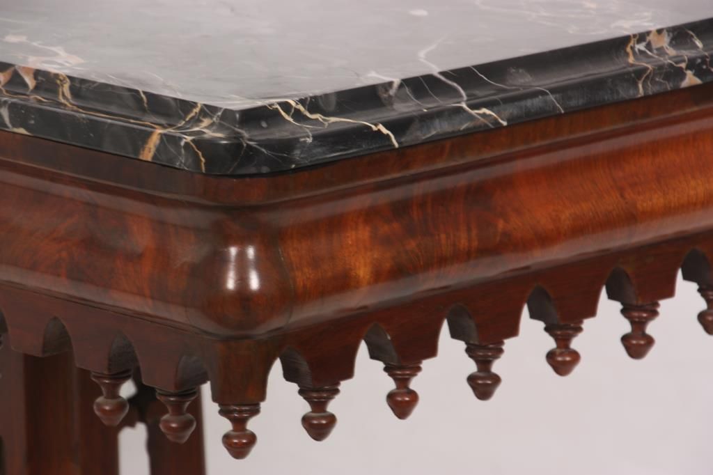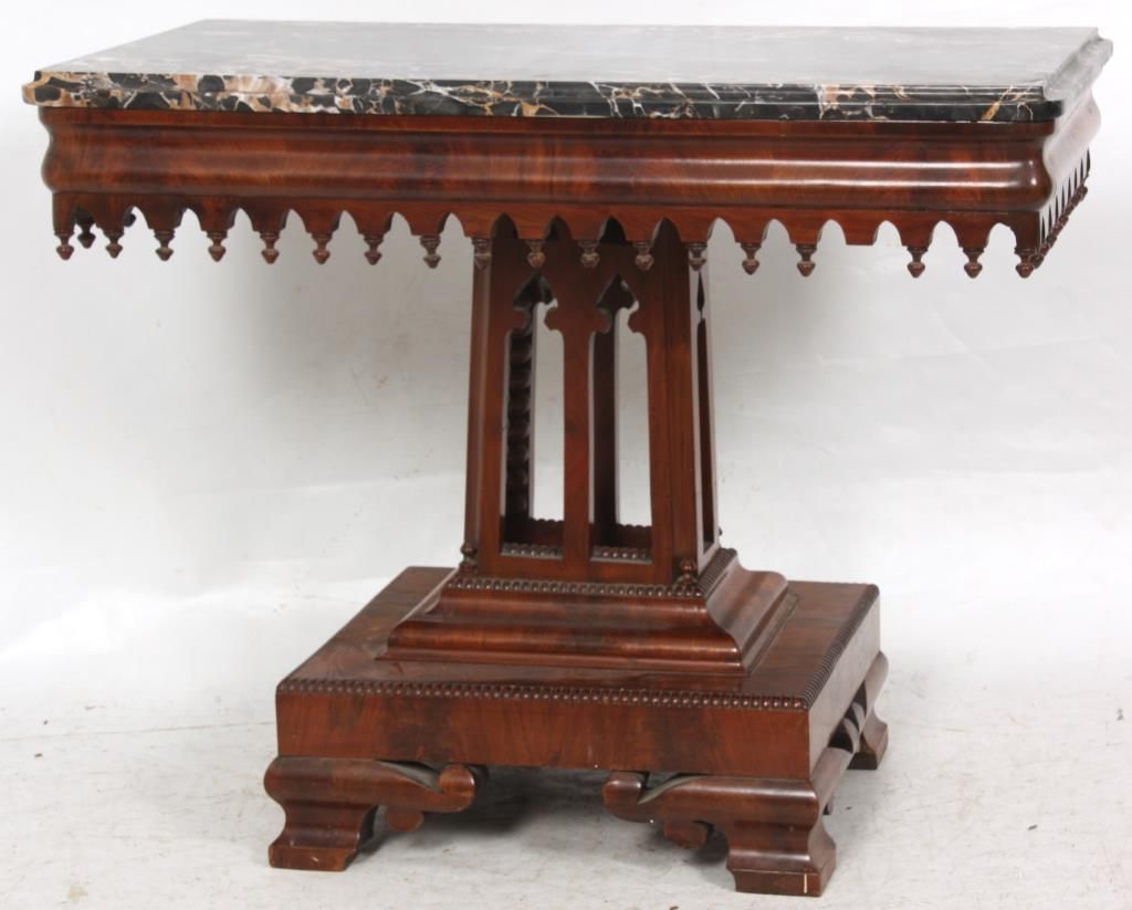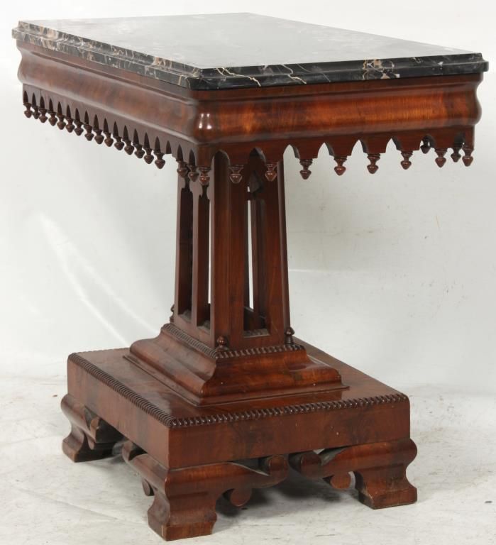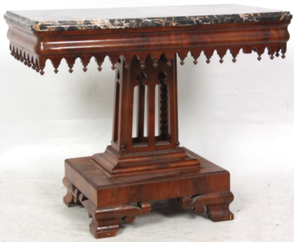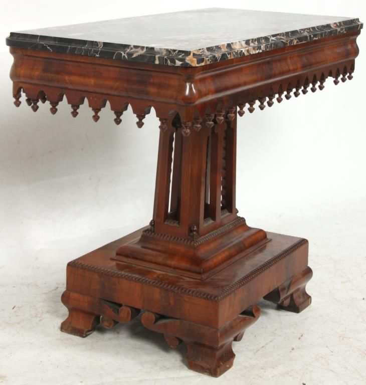 Mahogany Gothic Marble Top Table. Black marble top over a carved apron with turned teardrop finials; has a pyramidal center pedestal with open gothic arched cutouts, turned corner finials and beaded trim, on a rectangular platform base with fancy cut feet at the corners. In very good condition and original finish. Small 1 in. piece of veneer missing just below the marble. 30 in. high x 37 in. wide x 19 in. deep.