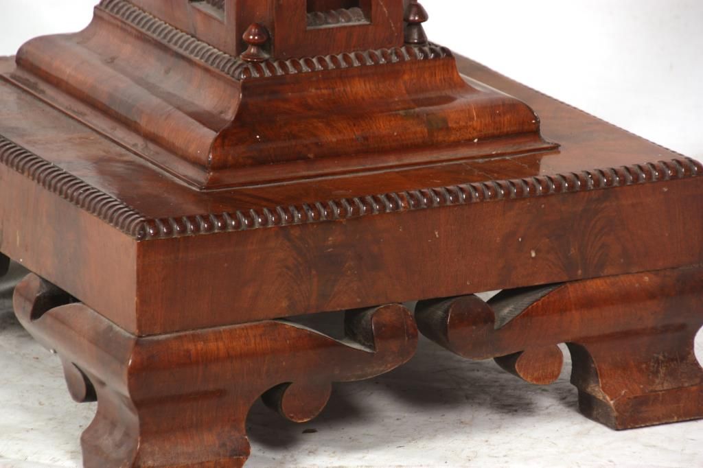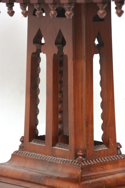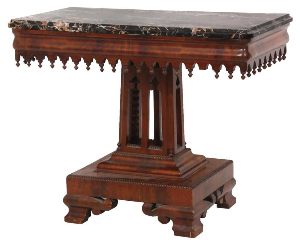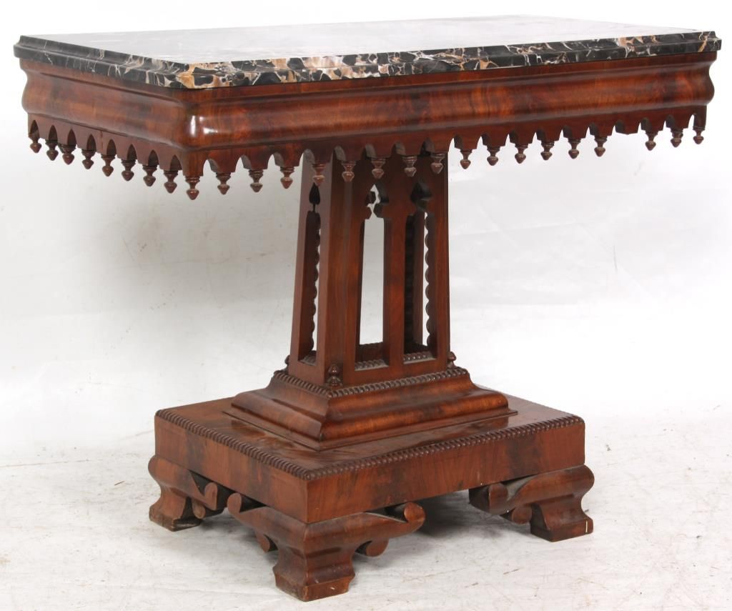 Mahogany Gothic Marble Top Table. Black marble top over a carved apron with turned teardrop finials; has a pyramidal center pedestal with open gothic arched cutouts, turned corner finials and beaded trim, on a rectangular platform base with fancy cut feet at the corners. In very good condition and original finish. Small 1 in. piece of veneer missing just below the marble. 30 in. high x 37 in. wide x 19 in. deep.