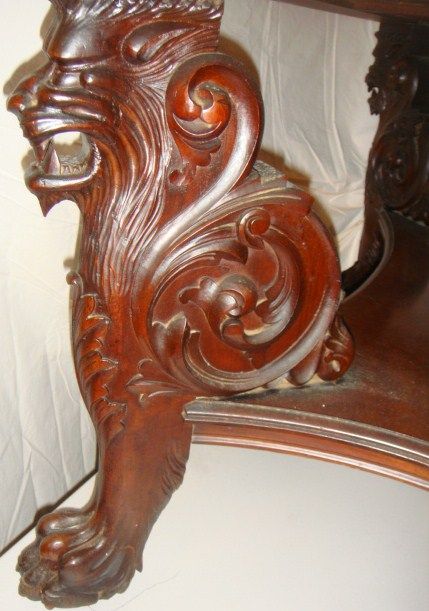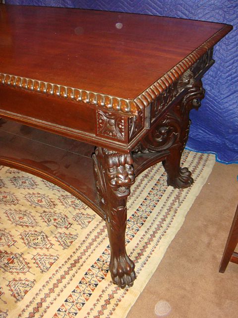 Mahogany Fully Carved "Griffins" Library Table with drawer at either end with carved North Wind Faces, rope twist apron top. Huge claw feet original finish. 29 in. tall 31 in. wide 48 in. long. Attributed to R. J. Horner. Base from the feet 27 in. wide, 44 in. on the base of the feet. Griffins are 22 inches tall. Matching 1870 Original finish mahagany director's chair will fully carved griffin's heads. Attributed to R. J. Horner, NY. A table like this one was featured in the movie "The Godfather".